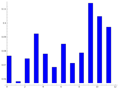 bar_chart function in Sage still needs a bit of work and at the moment can only print a single list of data so it automatically has the axis indexed from 0 onwards (not from 1 to 12 as we would want). We can easily fix this using some matplotlib code (Sage is just wrapping matplotlib anyway):
