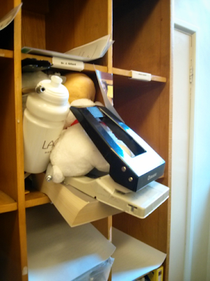 For a while now there's been a 'game' going on with our pigeon holes where people would put random objects in other people's pigeon holes (like the water bottle you see in the picture). These objects would then follow a random walk around the pigeon holes as each individual would find an object in their pigeon hole and absent-mindedly move it to someone else's pigeon hole.