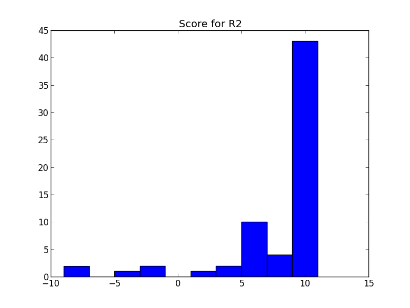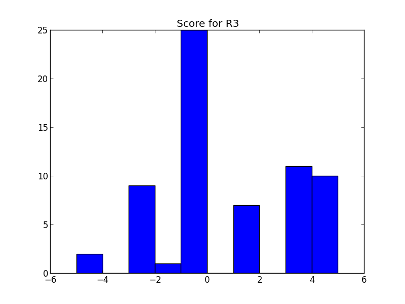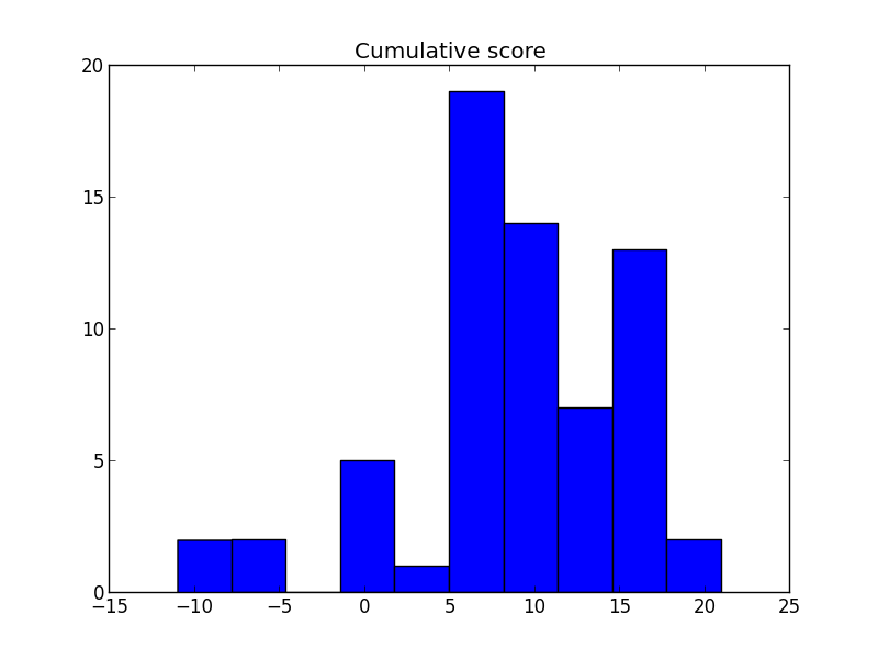 The mean score for this round was was .4 (which is quite close to the theoretical value of 0). Here's the distribution of the scores: